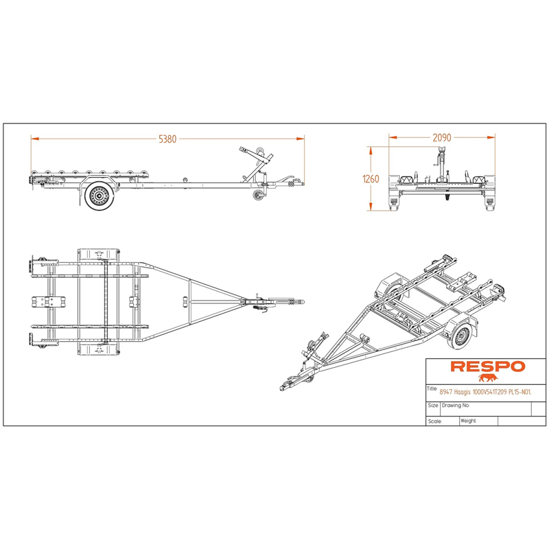 The Respo 1000V541T209 is a robust and reliable boat trailer designed specifically for rotationally moulded boats. Identical in design to the 750V511T209 model, this version is equipped with a braking system, offering enhanced safety and stability for heavier loads. It is officially approved by Pioner Boat AS and is perfectly suited for Pioner 13, Pioner 14, and Pioner 15 Allround models, as well as River 420 and 460 boats.