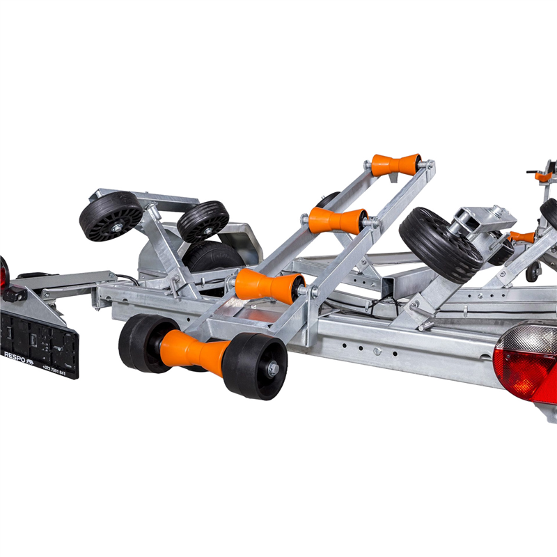 Launching and retrieving your boat is made effortless thanks to the rear tilting frame, which allows you to find the perfect angle for winching. The trailer is equipped with a comprehensive support system, including keel rolls and adjustable support rolls, ensuring your boat is secured safely and supported evenly during transport. For added versatility, the trailer features waterproof wheel hubs and Easyfold lights, allowing you to partially submerge the trailer in water without damaging the electrical components.
