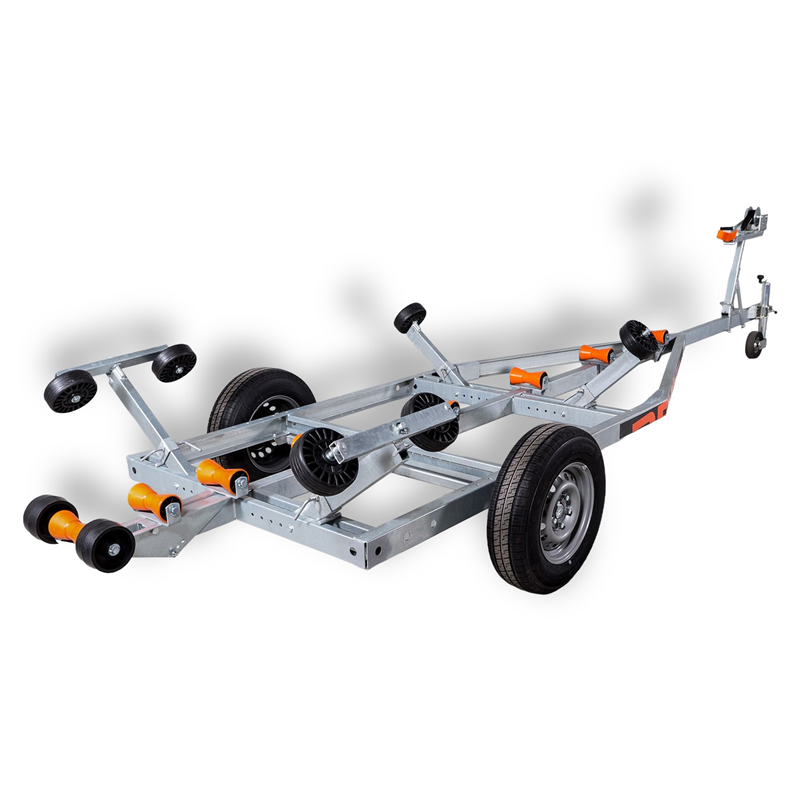 The 1600V651J182 harbour trailer is a robust and reliable solution designed specifically for the safe handling and storage of boats up to 6.5 metres in length. Constructed with a tough, hot-dip galvanised (HDG) welded steel frame, this trailer offers exceptional resistance to corrosion, ensuring longevity even in demanding coastal environments. The design features a sophisticated system of eight keel rollers, five of which are adjustable, alongside easy-to-adjust side rollers to provide uniform support and secure positioning for your vessel.