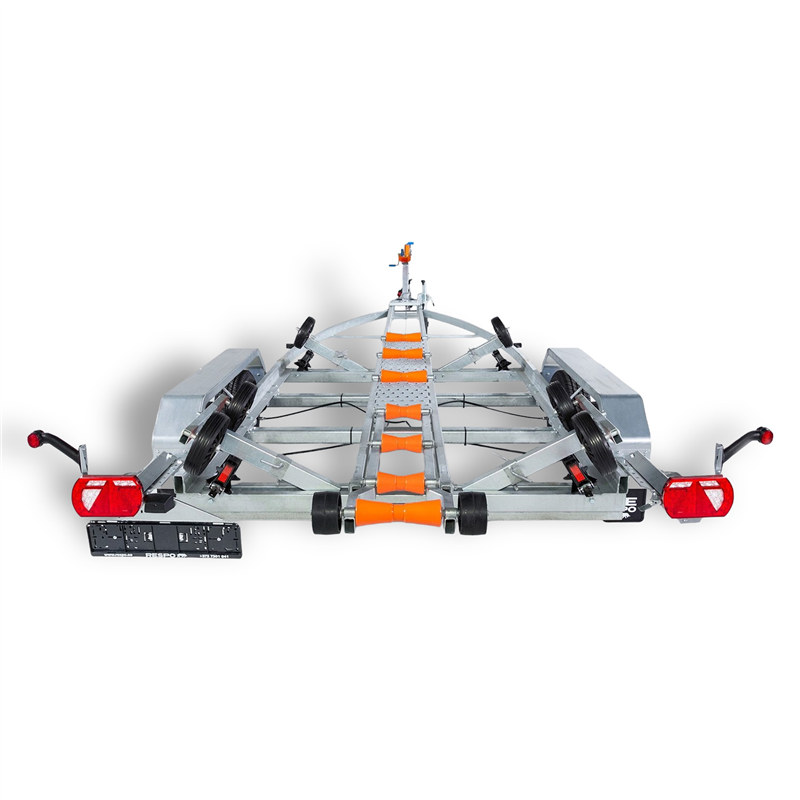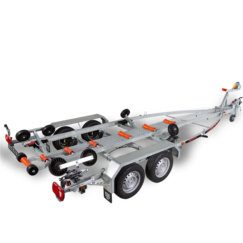 Heavy-duty tandem axle boat trailer for boats up to 7m. Features Magnelis® coating, waterproof LED lights, tilting frame, and 1458kg payload capacity.