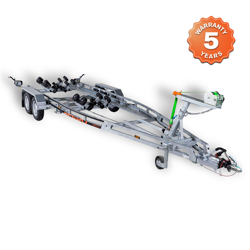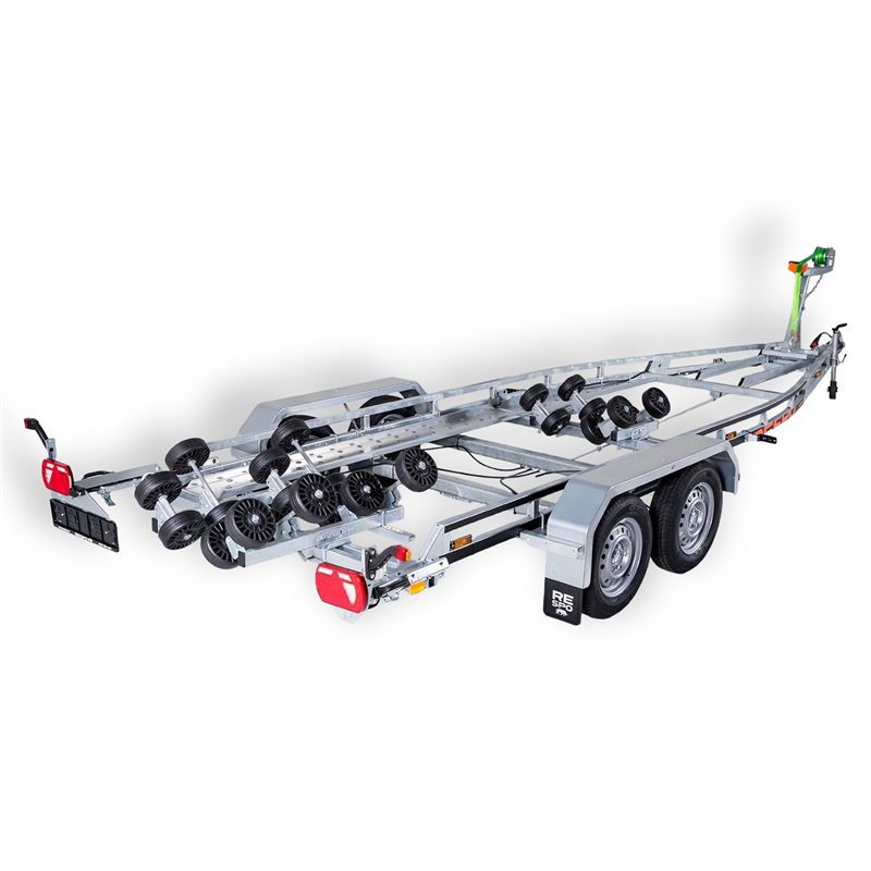 Heavy-duty double axle boat trailer with self-regulating multiroller system. Features Magnelis® corrosion protection and 1814kg payload capacity.