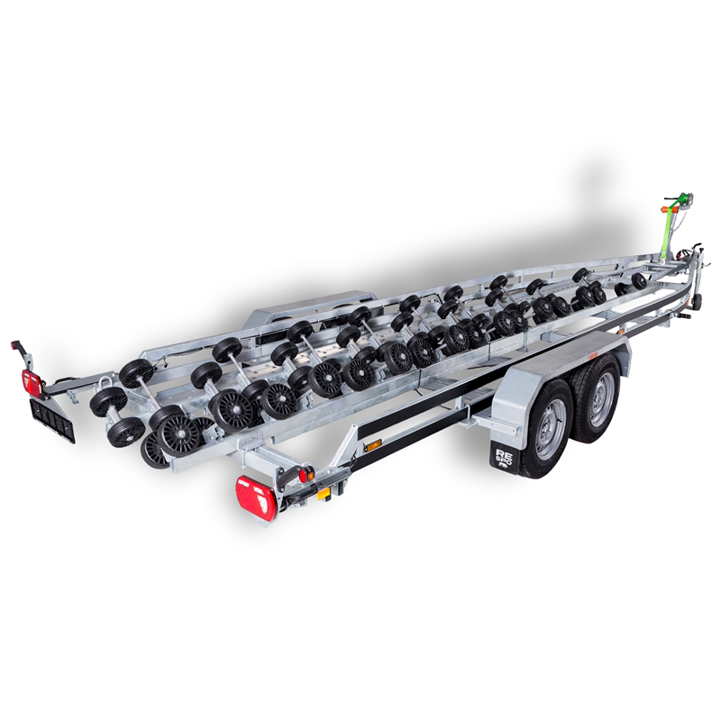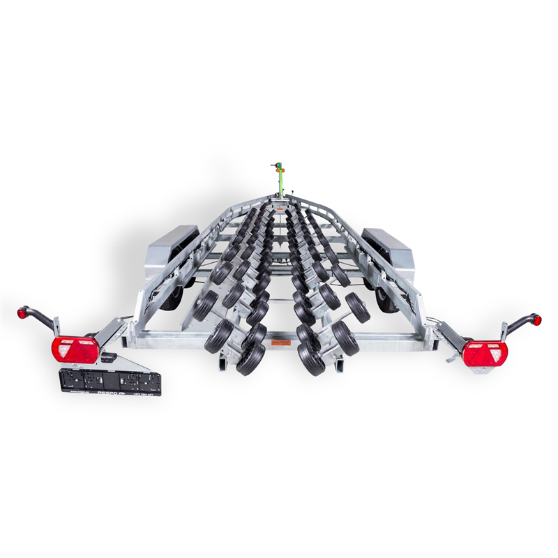 The 3500V912 Multiroller is an innovative heavy-duty trailer designed to provide the smoothest and safest loading experience for your vessel. Featuring a unique self-regulating roller system with 64 rollers, this trailer eliminates the need for keel rollers, making it perfectly suitable for boats with non-standard bottoms. The design ensures uniform support distribution, protecting your boat's hull during transport.