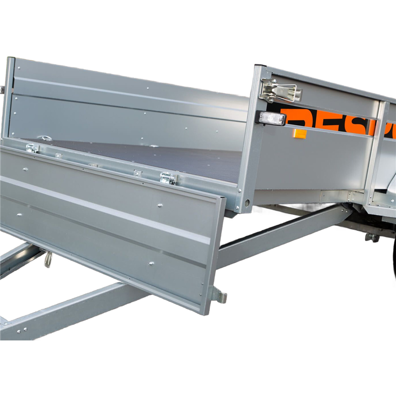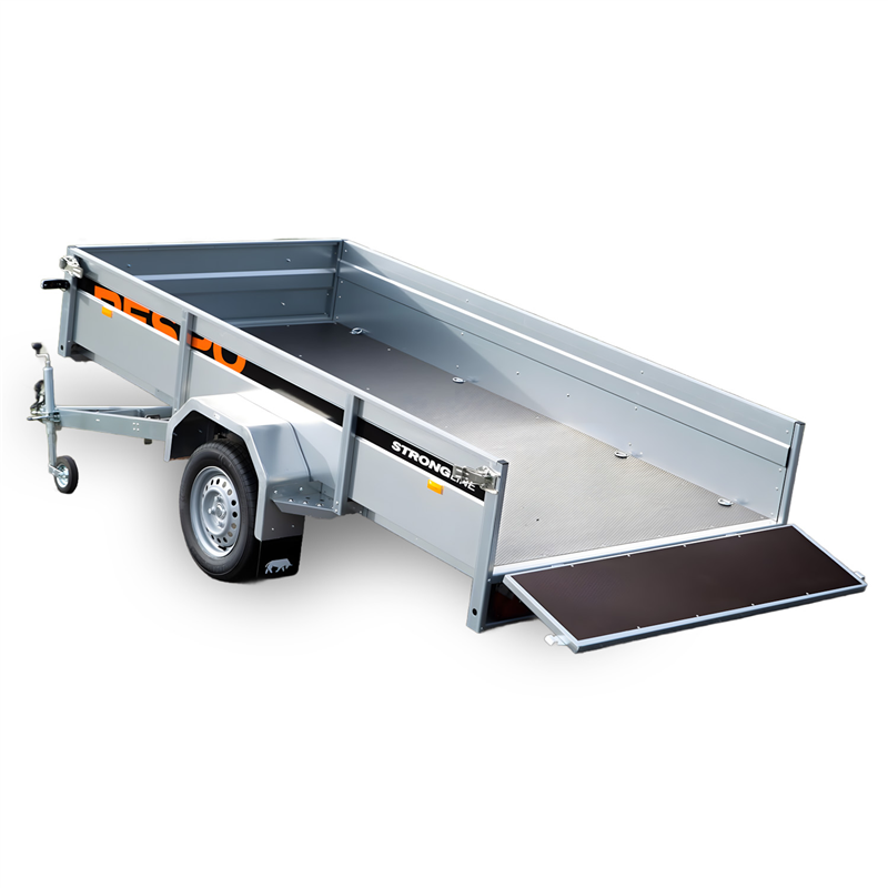 Exceptional handling and driving comfort are achieved thanks to a suspension system featuring 4-sheet leaf springs and shock absorbers. The trailer is equipped with waterproof wheel hubs and durable wheels, ensuring smooth operation. The cargo area is fitted with a durable plywood floor that is both waterproof and slip-resistant, providing a safe and secure surface for transporting goods. With a tipping function included, loading and unloading bulk materials is effortless.