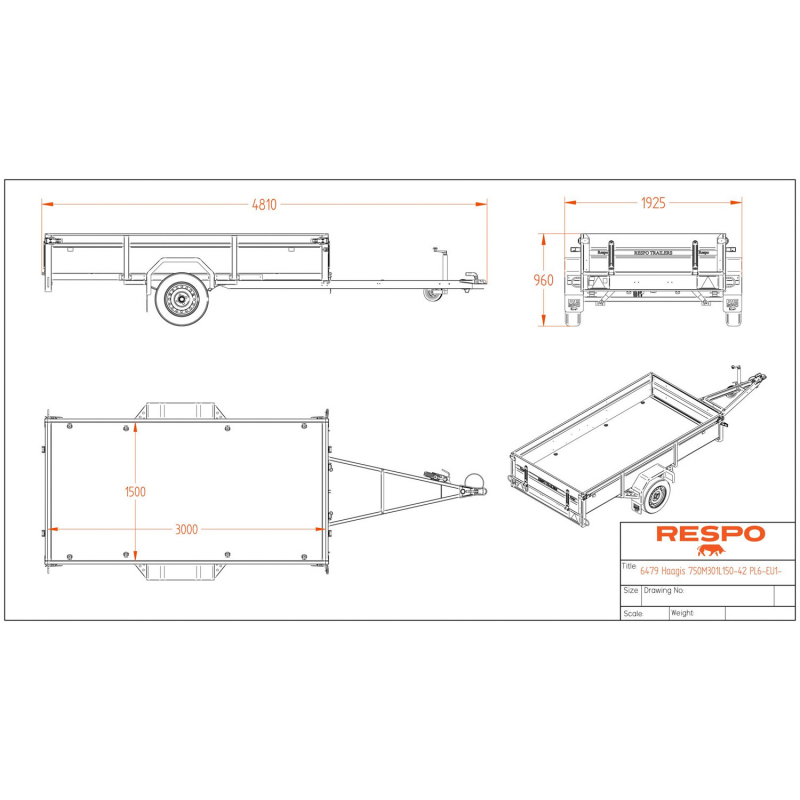 Heavy-duty 750kg trailer with Magnelis® coating, leaf spring suspension, and tipping function. Internal dimensions 3.00x1.50m. Includes waterproof LED lights.