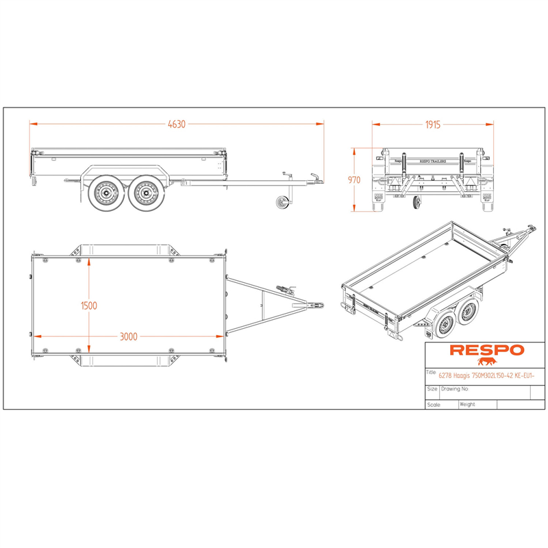 Robust welded frame trailer with Magnelis® coating and tandem leaf spring suspension. Features 3.00x1.50m internal dimensions, waterproof LED lights, and tipping function. Gross weight 750kg.