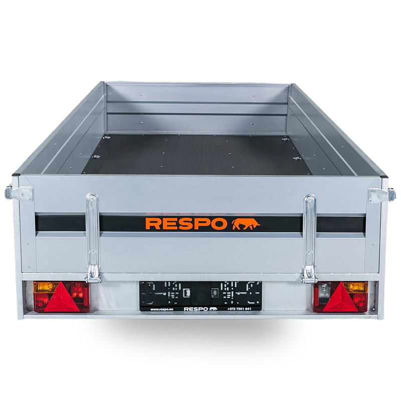 Excellent handling and stability are ensured by a suspension system comprising 3-leaf springs and shock absorbers, complemented by waterproof wheel hubs and durable wheels. The trailer features a robust plywood floor that is not only waterproof but also treated with a non-slip surface for safety during loading and transport. With a gross weight of 1500 kg and a tipping function, this braked trailer is the ideal solution for professional transport needs.