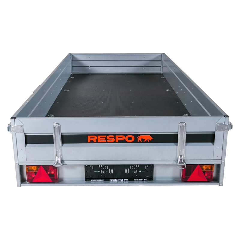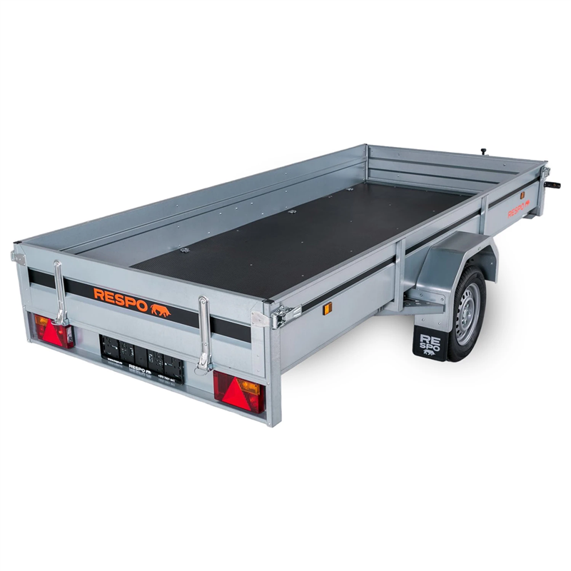 Superior road stability is achieved through a robust suspension system comprising 4-leaf springs and dedicated shock absorbers. The trailer is equipped with waterproof wheel hubs and M+S tyres, making it suitable for various weather conditions. The floor is crafted from high-grade, waterproof, and anti-slip plywood, providing a secure base for any load.
