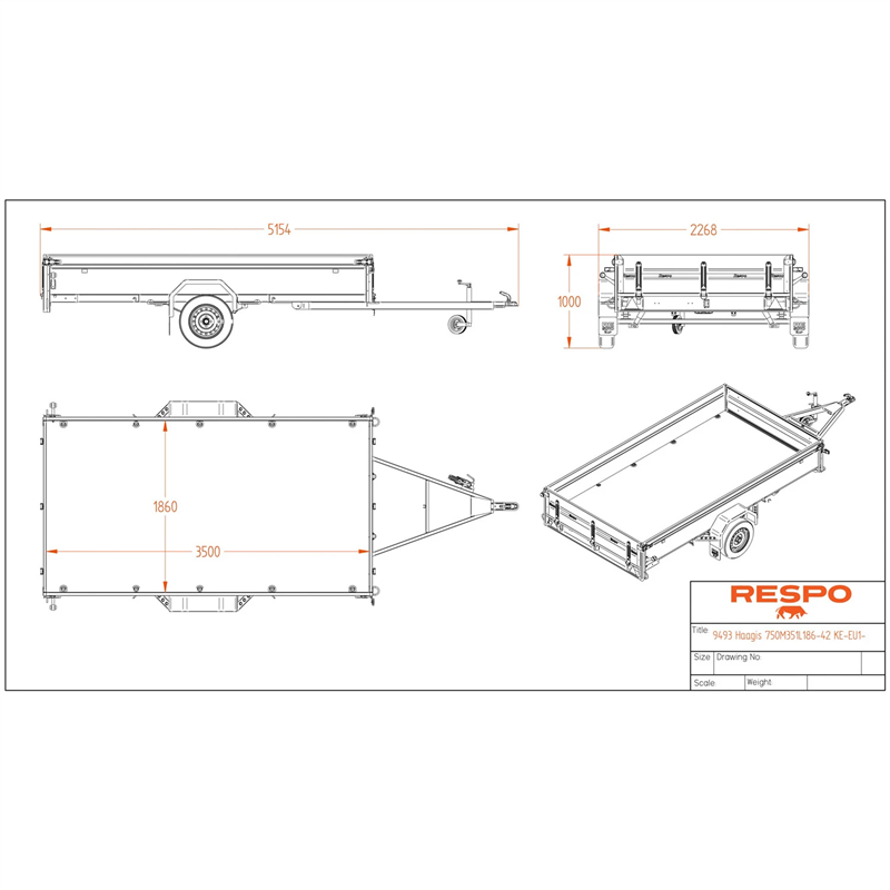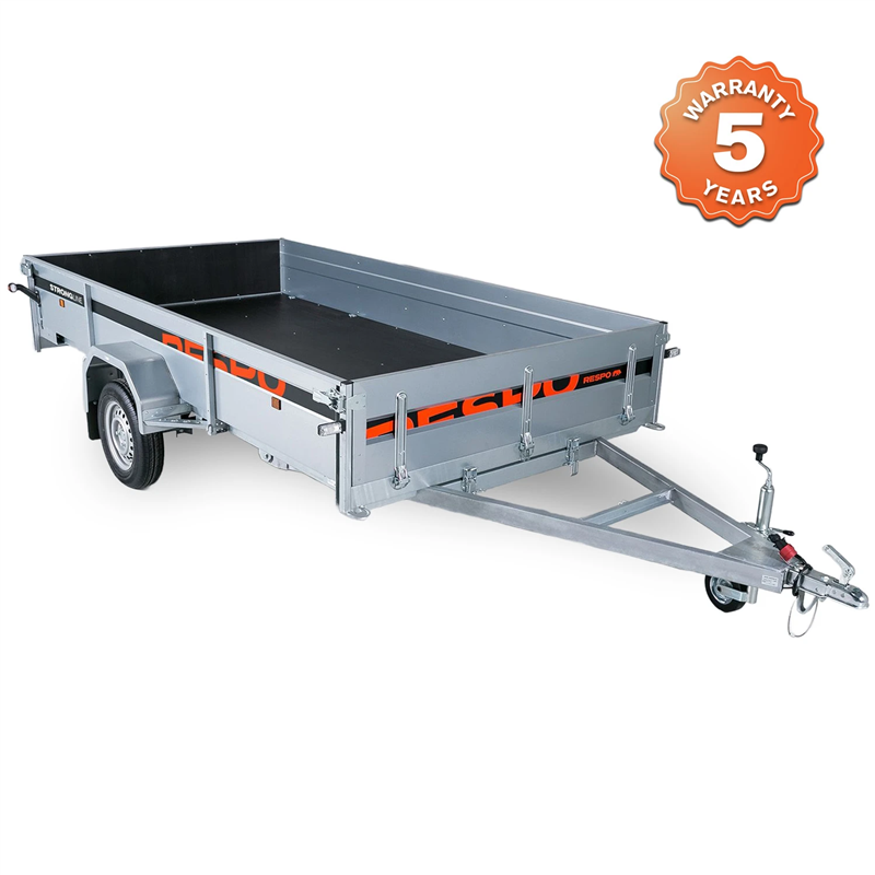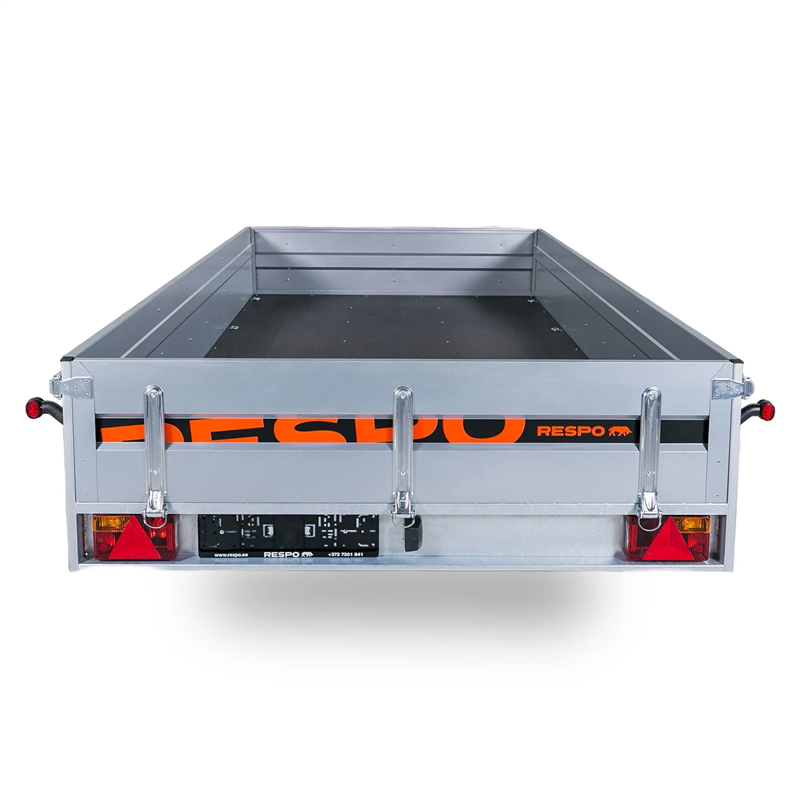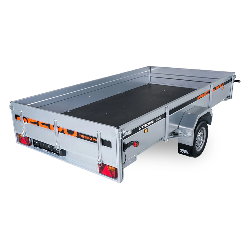 Outstanding handling and stability are achieved through a suspension system featuring 4-sheet leaf springs, shock absorbers, and waterproof wheel hubs. The trailer bed features a durable plywood floor that is both waterproof and slip-resistant, ensuring your cargo remains secure during transport. With a gross weight of 750 kg and a tipping function, this trailer is an ideal solution for general utility and transport needs.