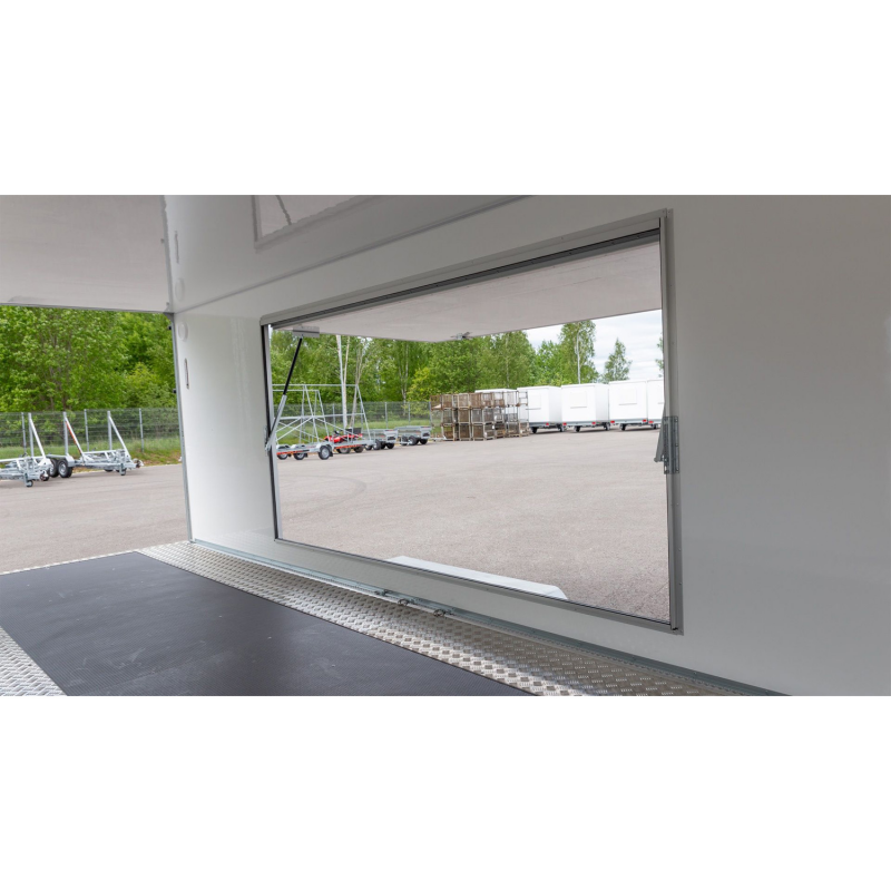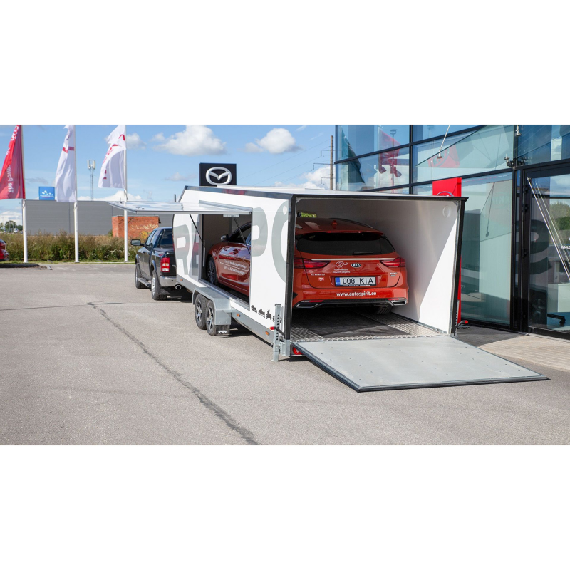 The trailer body is constructed from weatherproof 40 mm sandwich side panels, ensuring the contents remain protected from the elements. With a gross weight of 3500 kg and a substantial payload capacity of 2105 kg, it is an ideal solution for professional vehicle logistics and motorsport enthusiasts.