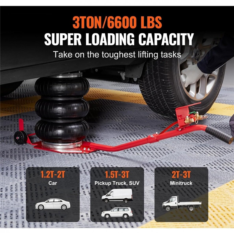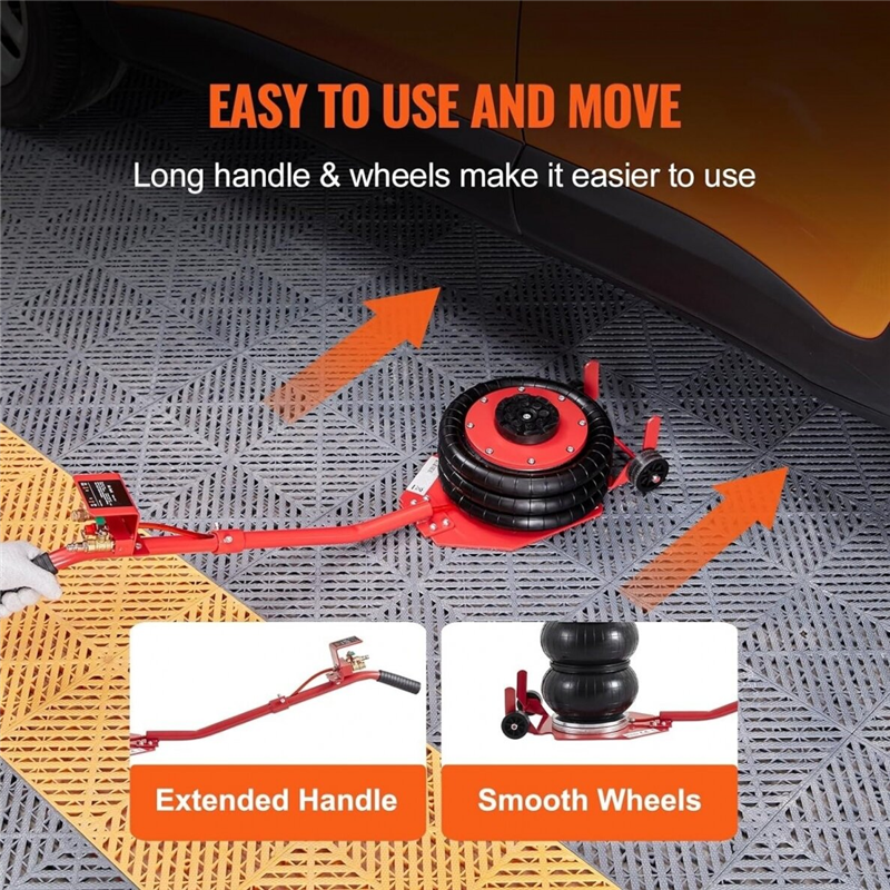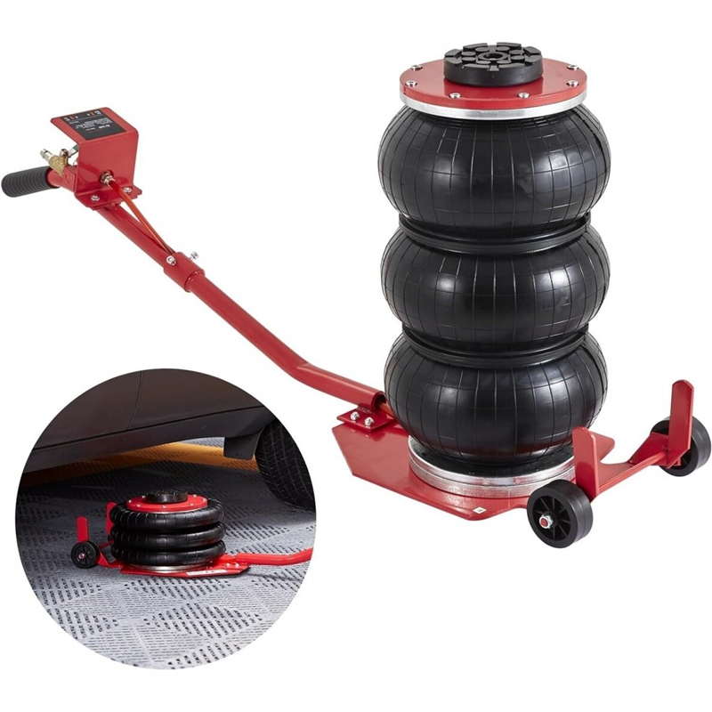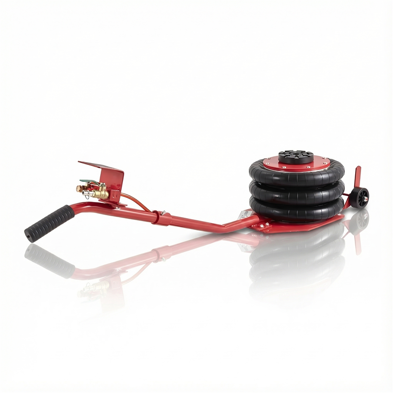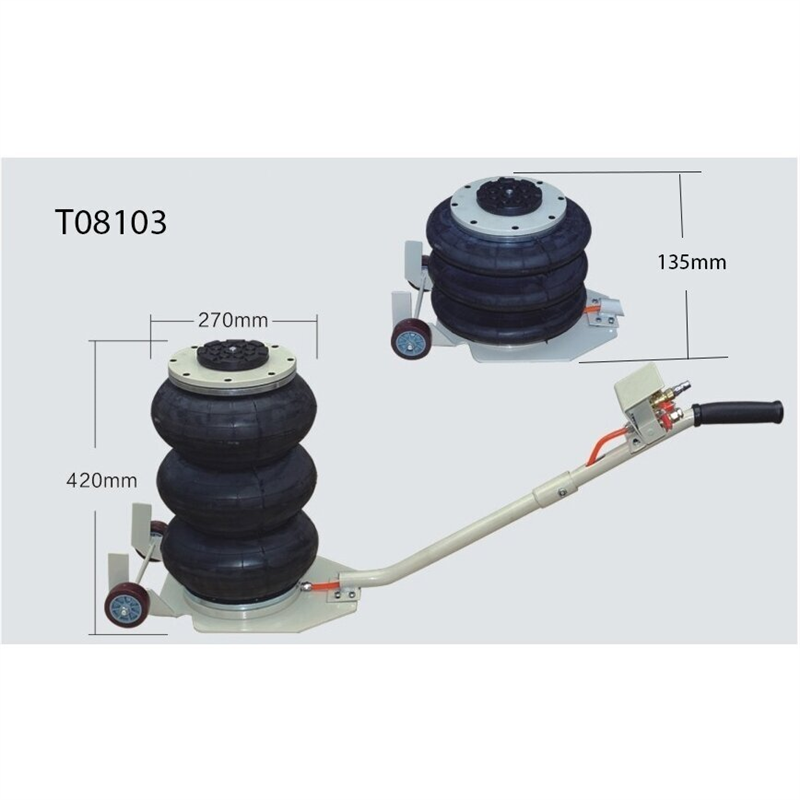 Air Jack 3T with three air bags features steel wheels with bearings, compact design, and safety-integrated drain valve. It offers a 3-ton lifting capacity and reliable, weather-resistant construction.