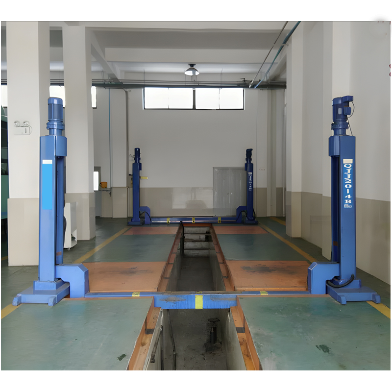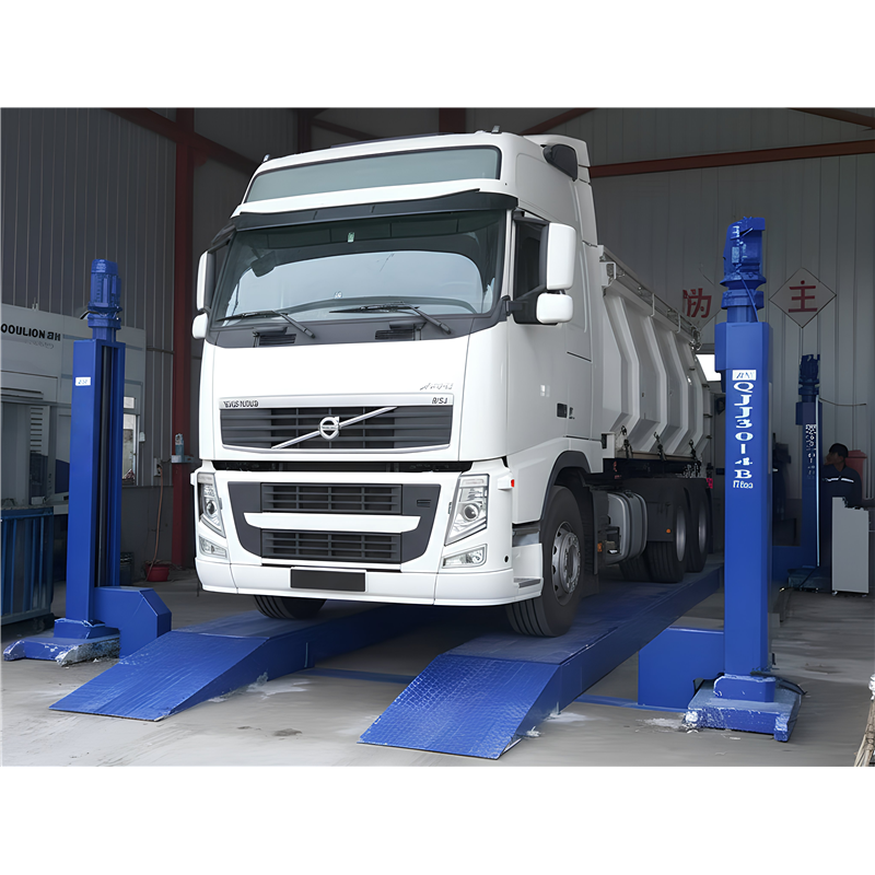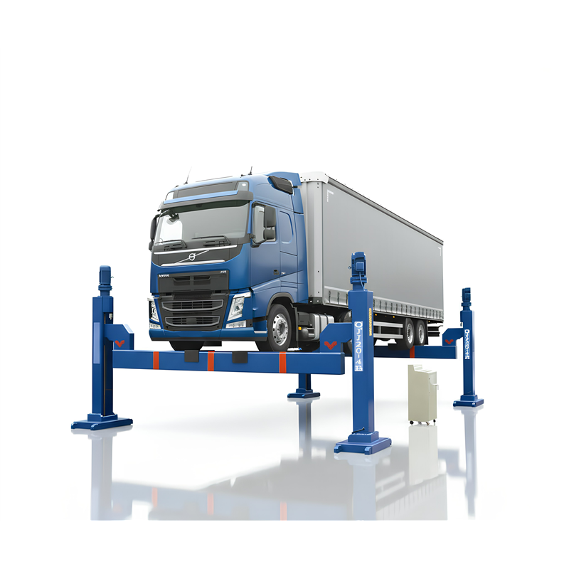 Heavy-duty 20-ton electromechanical four-column lift for passenger cars and trucks. Features precision orbital steel frame columns for superior load distribution. Built-in oriented lifting bracket enhances safety. Planet-cycloid reducer with screw-nut drive ensures smooth, controlled movement. Includes insurance brackets for secure positioning. Ideal for fleet workshops, municipal garages, and commercial vehicle service centers.