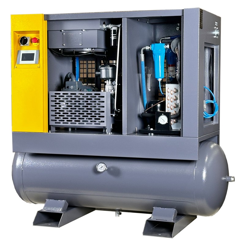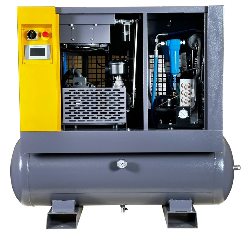 A 10 bar all-in-one Variable Speed Drive (VSD) compressor is a compact, energy-efficient, and multi-functional system designed to provide a complete compressed air solution. This type of compressor integrates an air tank, air dryer, and filtration system into a single unit, offering clean, dry, and stable compressed air. The VSD technology allows for automatic speed adjustments based on air demand, significantly reducing energy costs and enhancing operational efficiency. Here’s where this type of compressor excels.