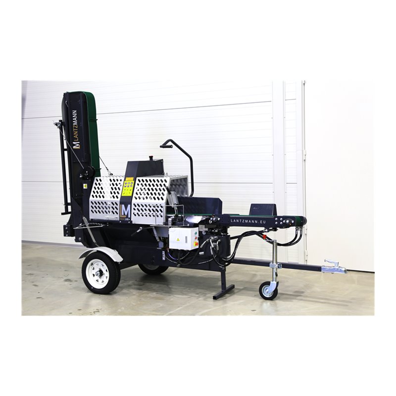 The chainsaw cuts the wood to the desired length, then the splitter divides the pre-cut log into two or four parts, the processed wood is transported by a conveyor belt to the selected location