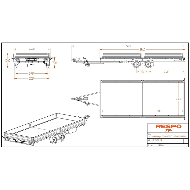 The 3500P552T225 is a robust and versatile flatbed trailer designed for professional heavy-duty transport. Engineered with a tough hot-dip galvanised welded steel frame, this trailer is built to withstand rigorous daily use. It utilises Magnelis® coated sheet metal, which provides superior protection, being three times more resistant to corrosion than standard hot-dip galvanised sheet metal.
