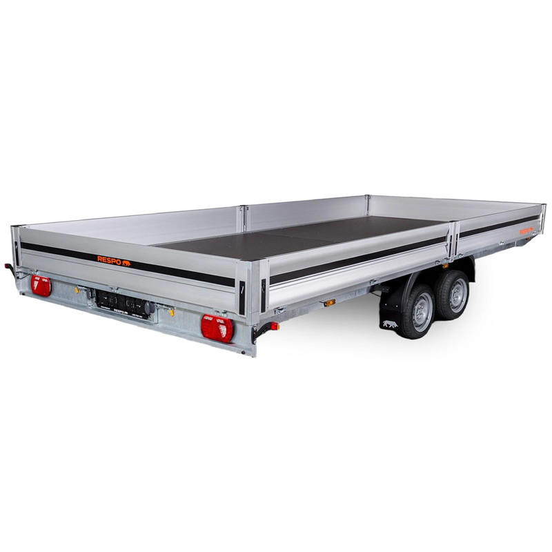 Stability and reliability are ensured by the double torsion axle system, offering a smooth towing experience even on difficult terrains. The trailer features a durable, waterproof, and slip-resistant plywood floor, ensuring your cargo remains secure. For maximum loading flexibility, all side boards and posts are easily removable, allowing for convenient loading from all sides—ideal for forklift operations.