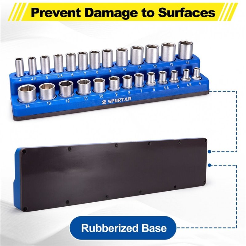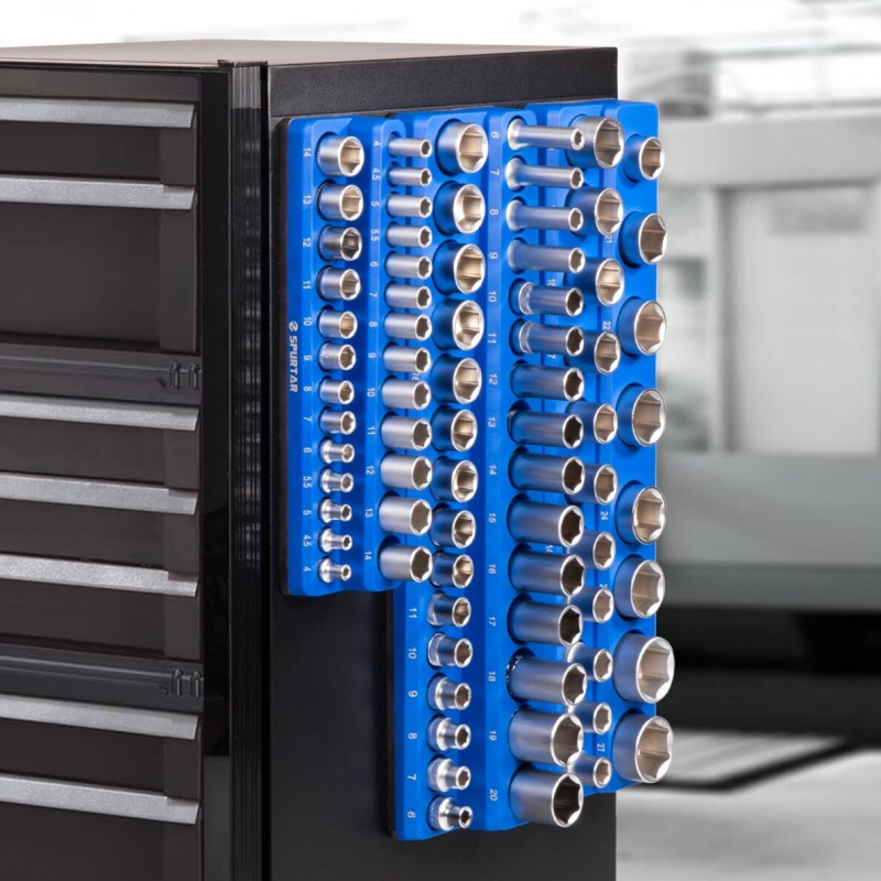 Set of 3 magnetic holders for heads in 1/2", 3/8", and 1/4" sizes, compatible with both standard and extended metric heads. Covers metric sizes from 4 mm to 27 mm, neatly organized in a compact case for easy storage and handling.