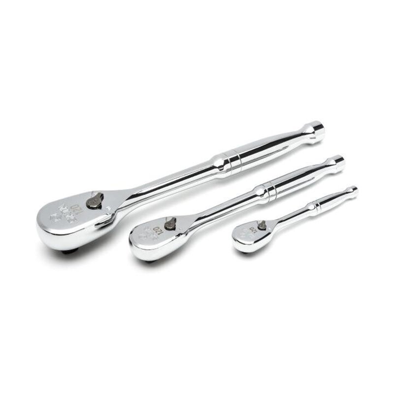 This 3-piece throat reversal ratchet set features oval heads with 120 teeth for precise 3° swing arc operation. Designed with dual double 60 teeth for exceptional strength, its closed head design prevents dirt ingress, ensuring smooth, reliable performance. The set is up to 50% thinner than conventional ratchets, with an ergonomic low-profile head and recessed on/off switch for tight spaces and easy one-handed reverse switching.