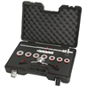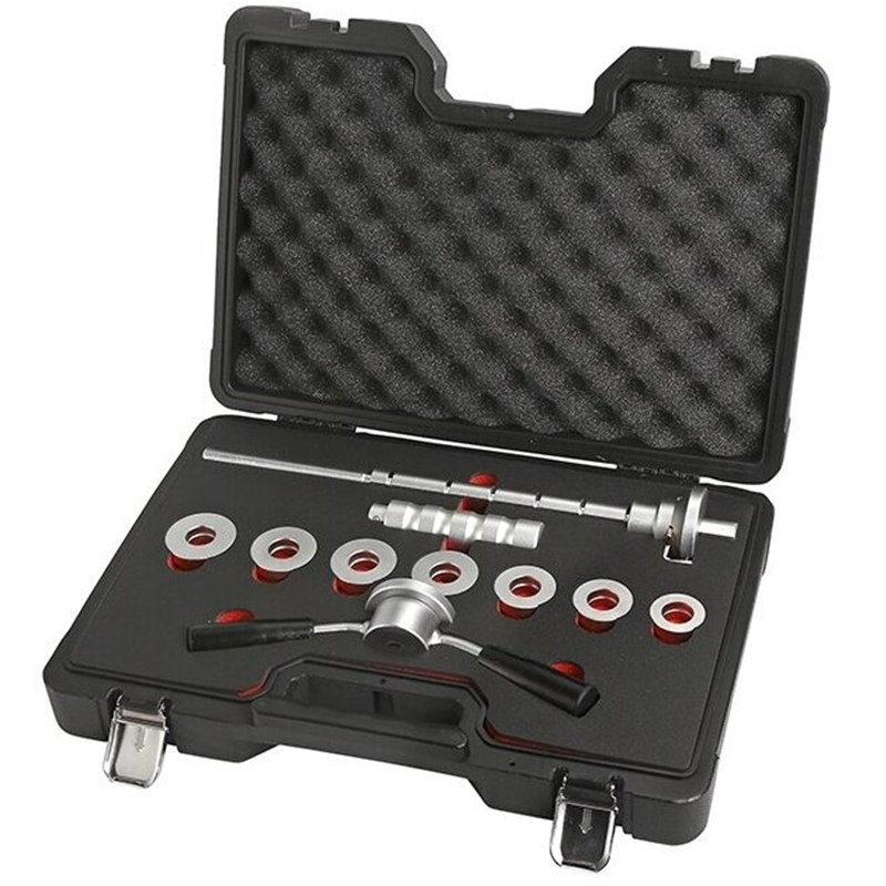 Steering bearing assembly kit designed for careful installation of upper and lower steering bearings. Suitable for Kawasaki, Honda, Harley-Davidson, and more. Includes pressing handle with nut, mounting screw, nylon washer, various press rings, washer plate, and washer for precise and safe bearing assembly.