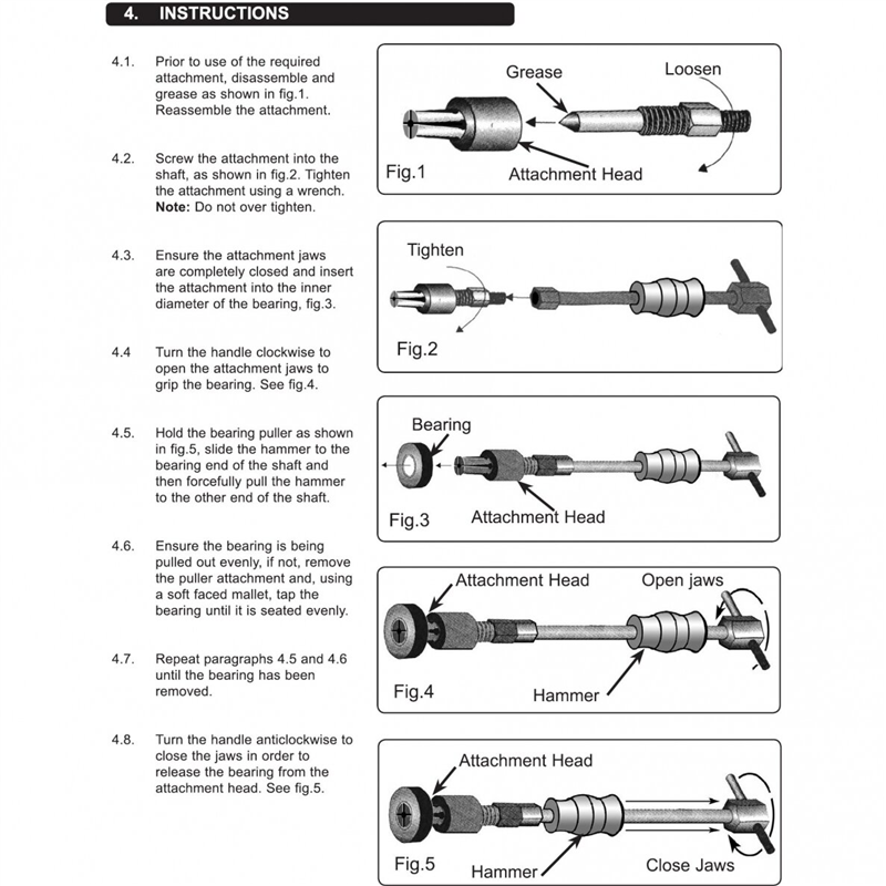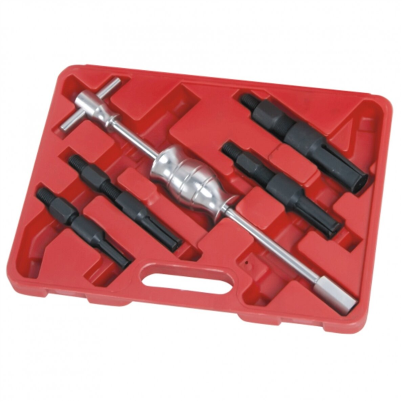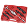 5-piece internal bearing remover set featuring a 0.85 kg reverse hammer (L=377 mm) and four bushings in sizes 10-14 mm, 15-19 mm, 18-25 mm, and 25-32 mm. Designed for efficient internal bearing extraction in various mechanical applications.