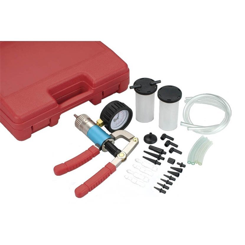 Multifunctional vacuum/pressure gauge AT2029 designed to measure and diagnose critical engine functions including fuel, ignition, transmission, emission, and air conditioning. The kit includes a container, hoses, and adapters for efficient brake fluid draining.