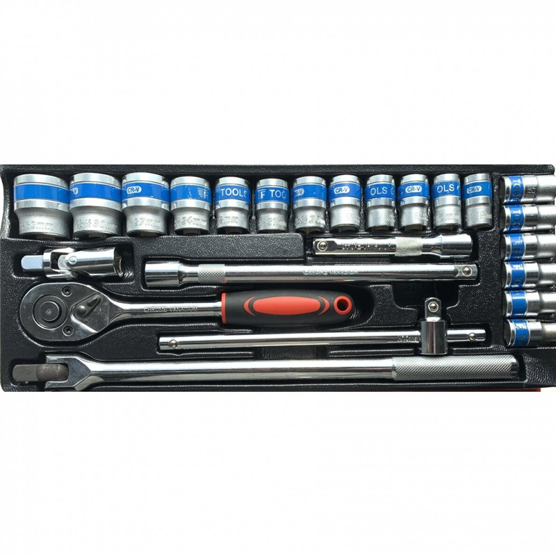 24-piece 1/2" head set made of durable CR-V steel. Includes 18 socket heads sized 10 to 32 mm, 2 extenders (125 mm and 250 mm), 1 candle head (21 mm), 1 universal joint, and 3 types of handles for versatile use.