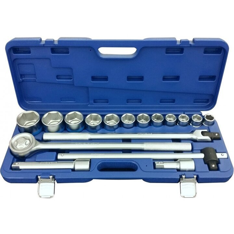 18-piece 3/4" drive head set includes 12 socket heads sized 21 to 50 mm, 2 extenders (200 mm and 400 mm), T-shaped handle, flexible handle, and a plastic storage box. Compact and durable for various heavy-duty mechanical tasks.