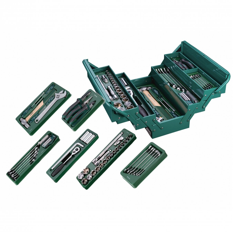 70-piece SATA tool set in a galvanized steel cantilever box. Includes 1/2” quick-release nut, 17 socket heads (8-32 mm), extended heads, combination wrenches, screwdrivers, adjustable and pliers tools, hammer, hex keys, and gauges for versatile workshop use.