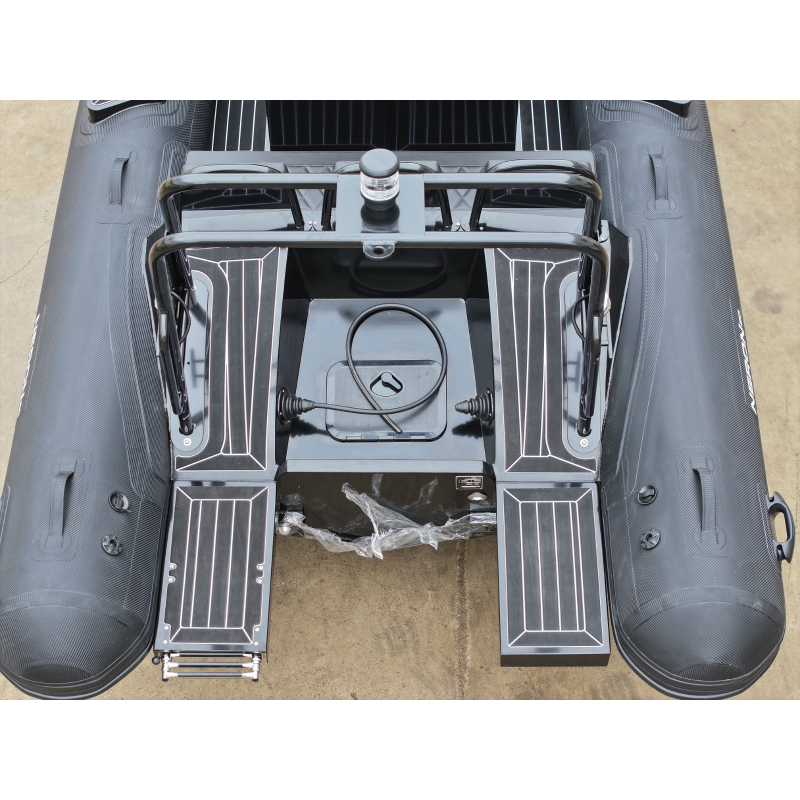 High-performance 5.8m aluminium RIB boat with up to 115HP engine capacity, built-in 105L fuel tank and full premium equipment. Carbon-pattern 1.2mm PVC tubes, EVA flooring, integrated tube steps, folding seating system and complete setup including anchor with chain. Designed for demanding users who expect power, comfort and durability.
