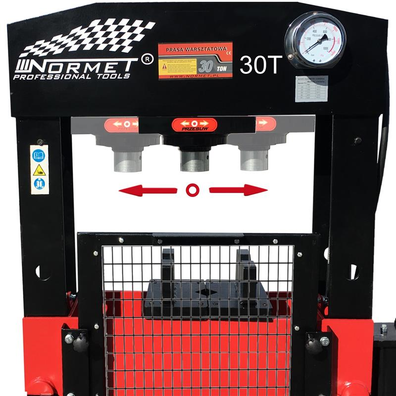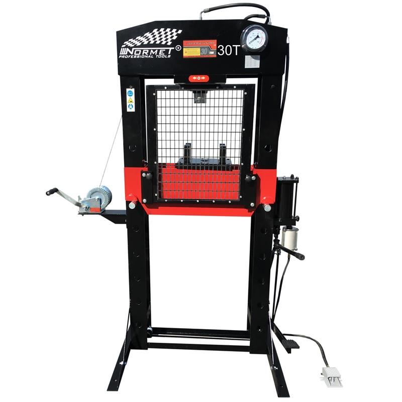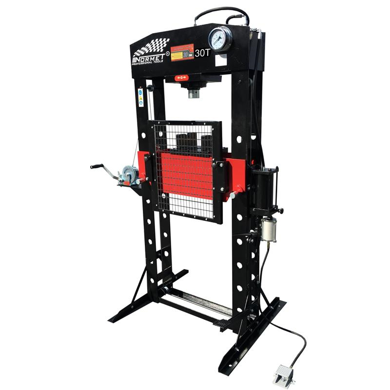 The 30T Normet hydraulic press features a stable welded structure, three actuator drive options (manual, foot, pneumatic), and an adjustable table for versatile mechanical workshop applications.