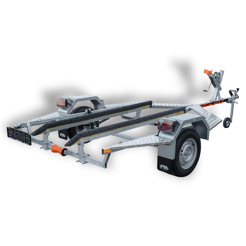 Designed for functionality and convenience, this model features specially designed step-on fenders and a dedicated walkway, allowing for safe and easy access around your jet ski. The jet ski holders are effortlessly adjustable to suit your specific vessel, while the included winch ensures loading and unloading is a smooth, simple process. With watertight hubs and waterproof LED lighting throughout, this trailer offers reliability and peace of mind for every journey to the water.