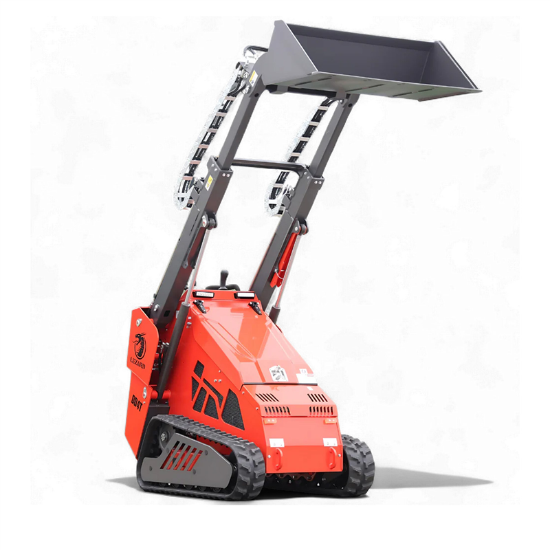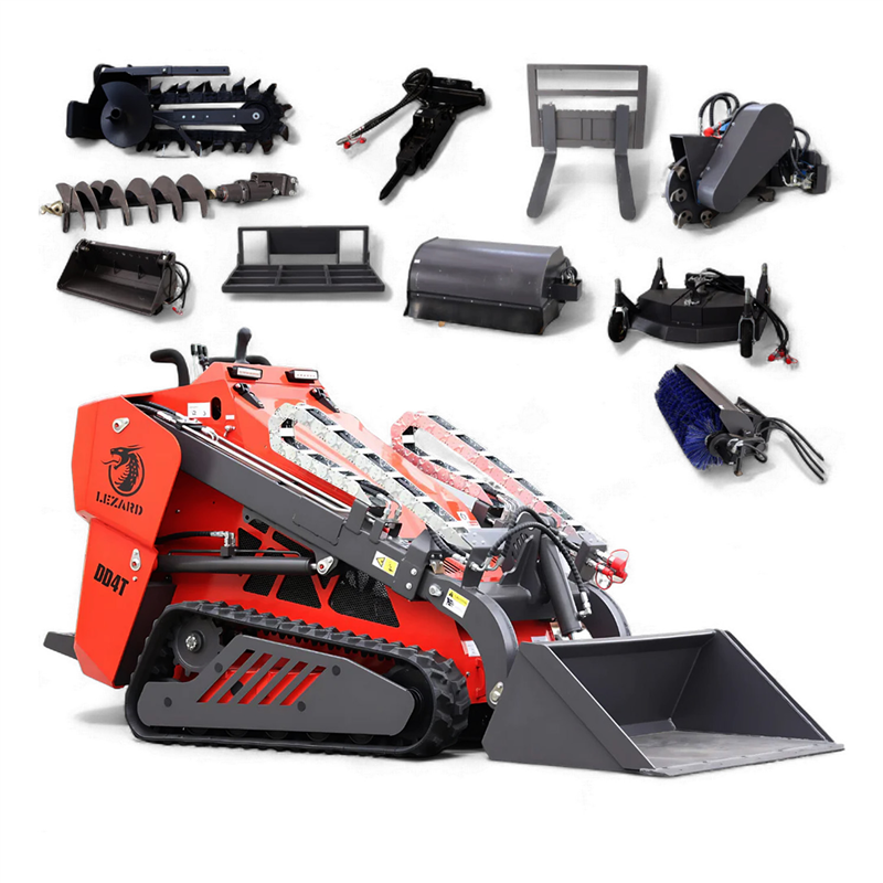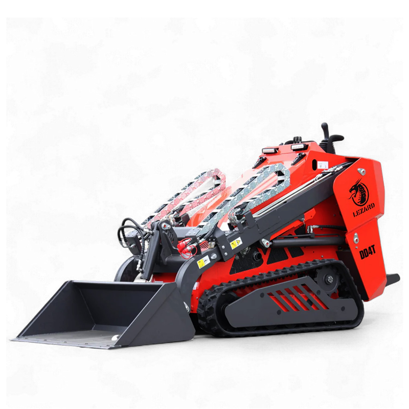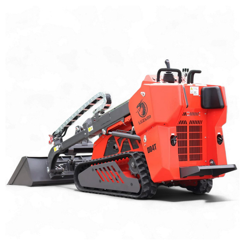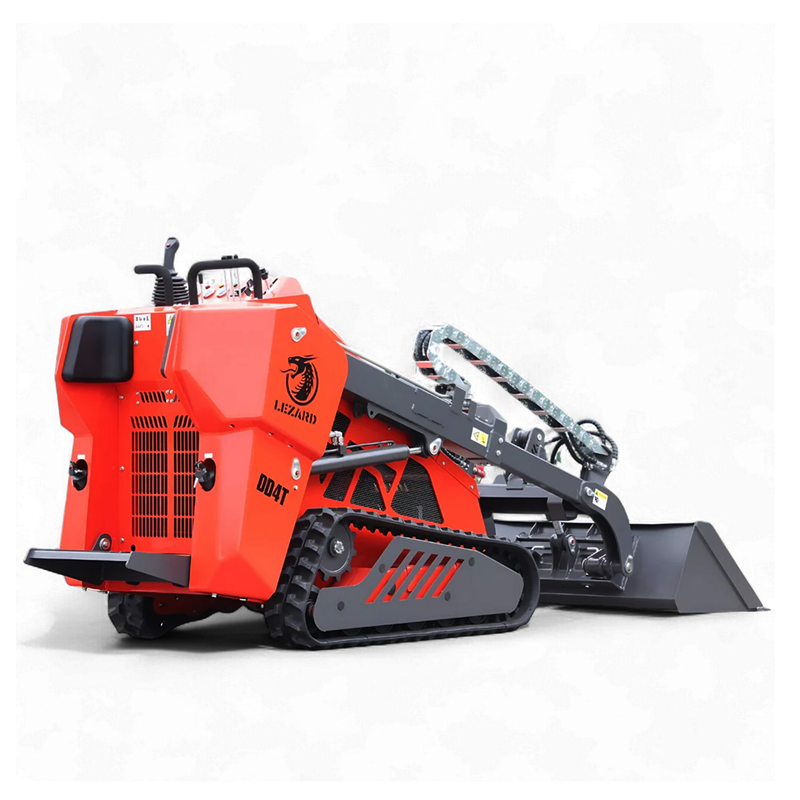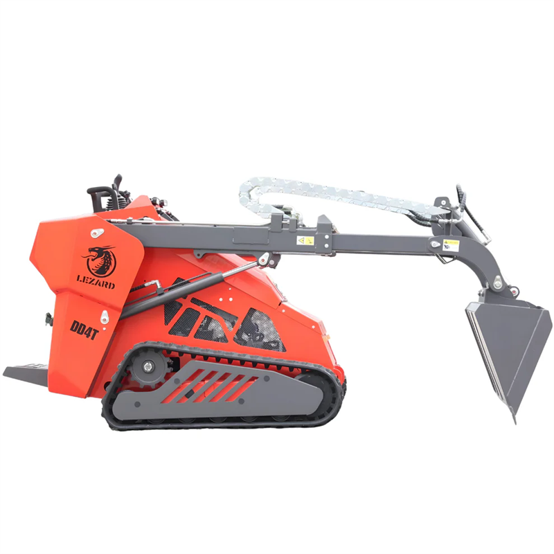 The LEZARD KUBOTA DD4T is a premium tracked mini skid steer loader featuring a unique telescopic boom, a robust 25 HP KUBOTA D1105 diesel engine, and an Italian PWG hydraulic pump. It boasts a zero turning radius and a suspended operator platform for maximum comfort.