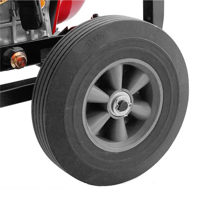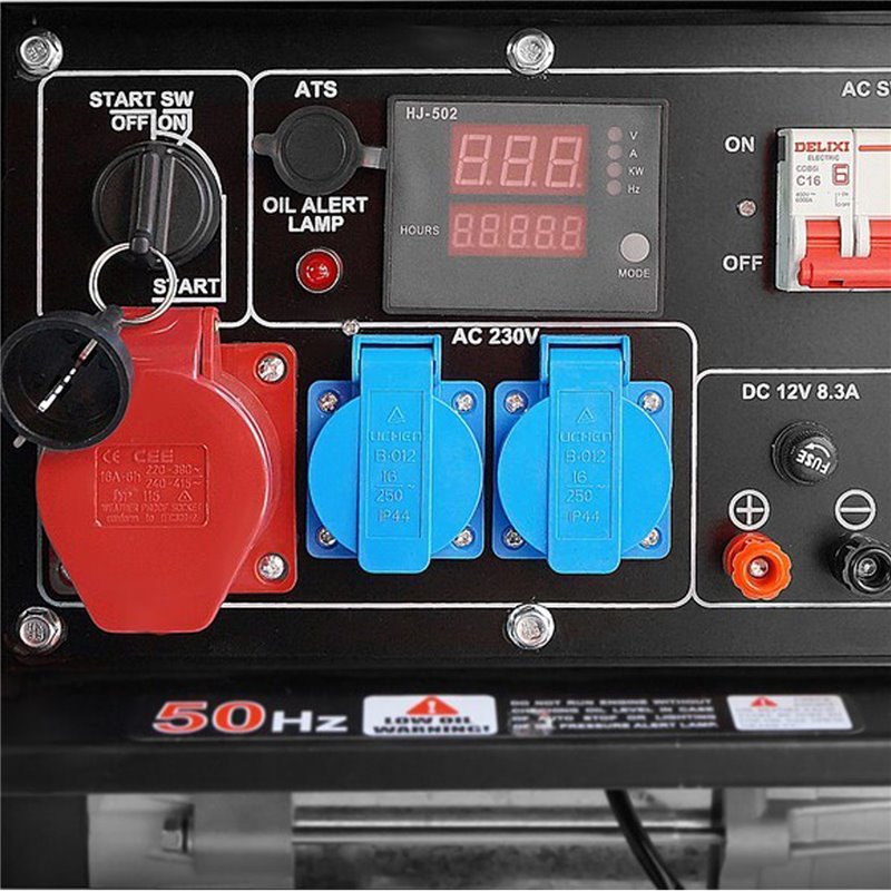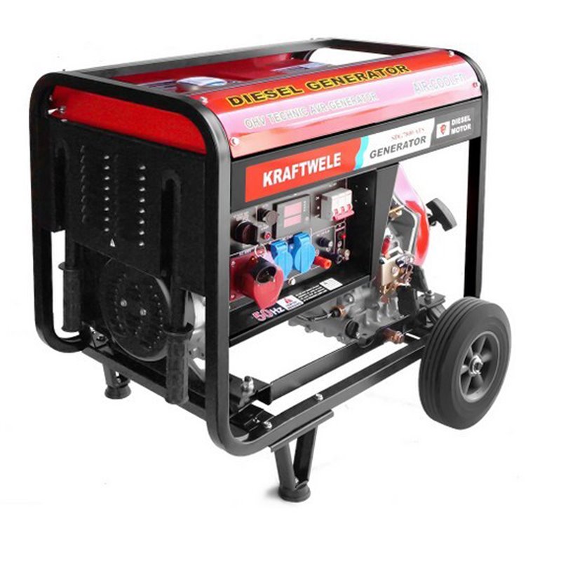 The generator has - voltmeter, fuel level indicator, voltage regulator (AVR system), anti-vibration padding, transport wheels, handles, battery.