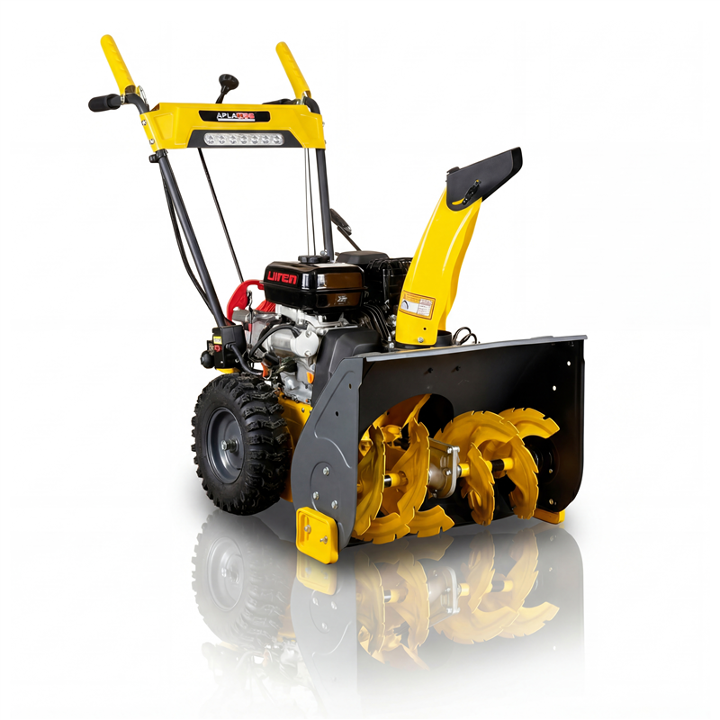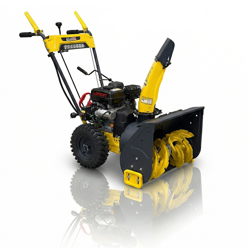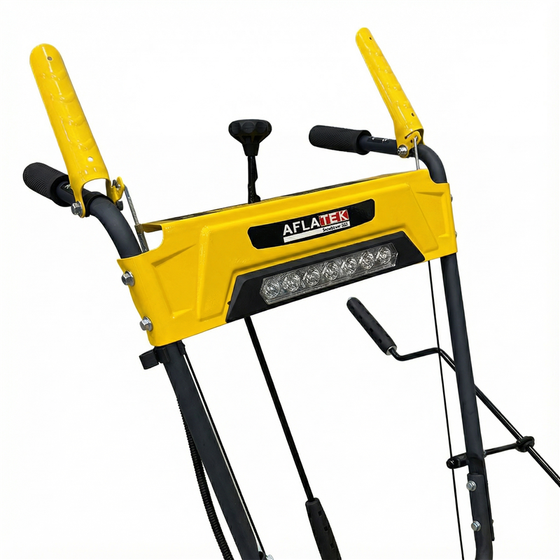 AFLATEK SnowMaster 56E: Compact and reliable snow blower with a 6.5 HP Loncin engine and 230V electric start. Designed for moderate snow removal, it features a 56 cm clearing width, 42 cm depth capacity, and sturdy 12" Snow Hog tires. Equipped with LED lighting for enhanced visibility. Perfect for residential winter maintenance!