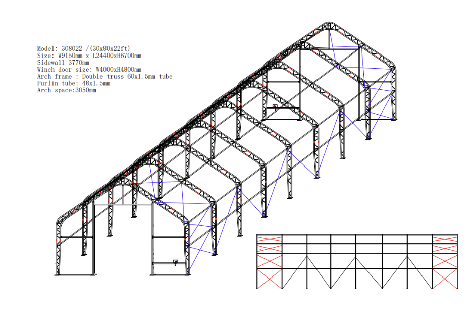 Heavy duty industrial storage tent 223.2 square meters, 9.15m x 24.4m x 6.7m, double truss arch tube system with 60mm x 1.5mm construction, 650gsm PVC Cover